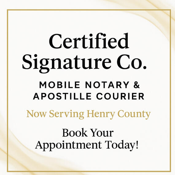 Certified Signature Co. offers mobile notary, apostille courier, and fingerprinting services in Henry County, GA. Fast, secure, and professional at your doorstep.